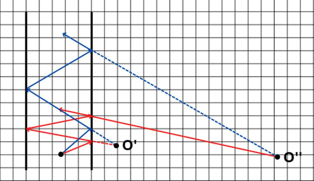 Obrazy oznaczono O’ i O’’. Powstaną one w punktach przecięcia się przedłużeń promieni świetlnych odbitych od prawego lustra. Są to obrazy pozorne.