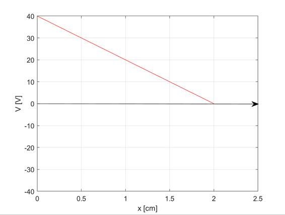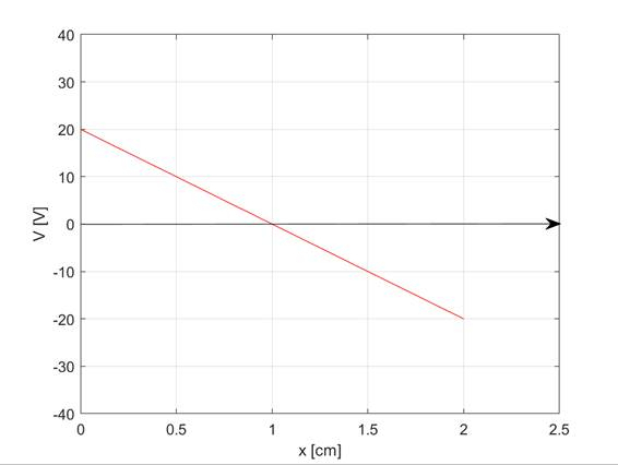 Potencjał maleje liniowo wraz z oddalaniem się od okładki dodatniej, najmniejsza wartość jest taka sama jak wartość potencjału okładki ujemnej.