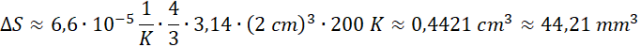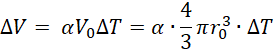 Korzystamy ze wzoru na przyrost objętości podstawiając odpowiednie dane liczbowe. Wiemy, że współczynnik rozszerzalności objętościowej jest ok. 3 razy większy niż współczynnik rozszerzalności liniowej.