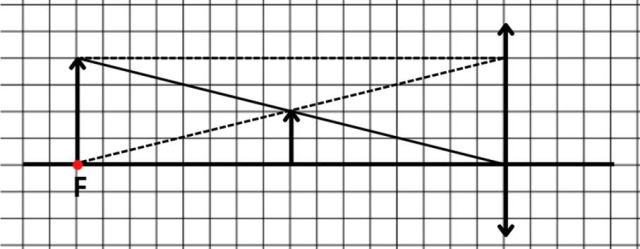 Poprowadź przedłużenie linii poziomej od przedmiotu do soczewki. Potem poprowadź z tego punktu przedłużenie promienia przechodzącego przez obraz. W miejscu, w którym przetnie się z osią optyczną, będzie ognisko. Odległość ogniska od soczewki to ogniskowa.