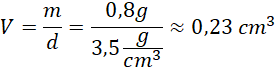 Aby policzyć objętość, należy przekształcić wzór na gęstość i podstawić do niego gęstość diamentu i jego masę; skoro 1 karat to 0,2 g, to 4 karaty = 0,8 g.