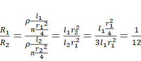 Zapisz wzór na wartość oporu jako iloczynu oporu właściwego i stosunku długości do przekroju. Oblicz wartość stosunku oporów każdego z drutów.