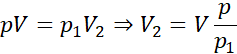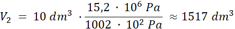 Obliczamy objętość, jaką zajmie sprężony w butli gaz, gdy będzie miał ciśnienie atmosferyczne. Zakładamy, że temperatura jest stała, czyli zachodzi przemiana izotermiczna i iloczyn pV jest stały: