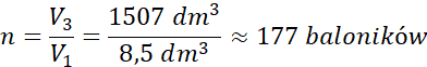 W butli musi pozostać 10 dm3 gazu, czyli na napełnianie balonów przeznaczono około V3 = 1507 dm3 gazu. Liczba wypełnionych balonów to: