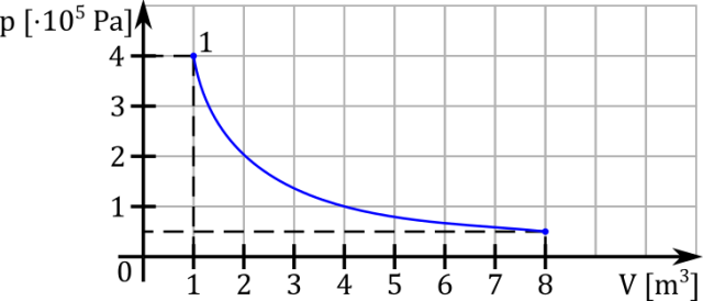 W przemianie izotermicznej iloczyn pV pozostaje stały, więc ośmiokrotny wzrost objętości spowoduje ośmiokrotny spadek ciśnienia. Przemiana jest izotermiczna, więc na wykresie V(p) jest ona funkcją homograficzną.