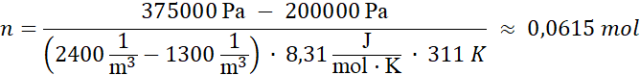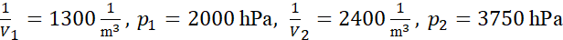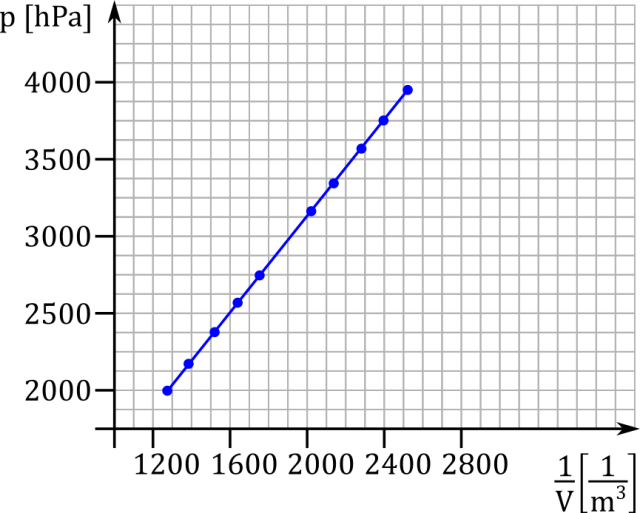 Korzystamy z równania Clapeyrona. Jako ciśnienia używamy różnicy ciśnień odczytanych z wykresu, a jako odwrotności ciśnienia odczytanych z wykresu wartości z osi X. Wybieramy takie dwa punkty, których wartości obu osi łatwo nam jest odczytać.