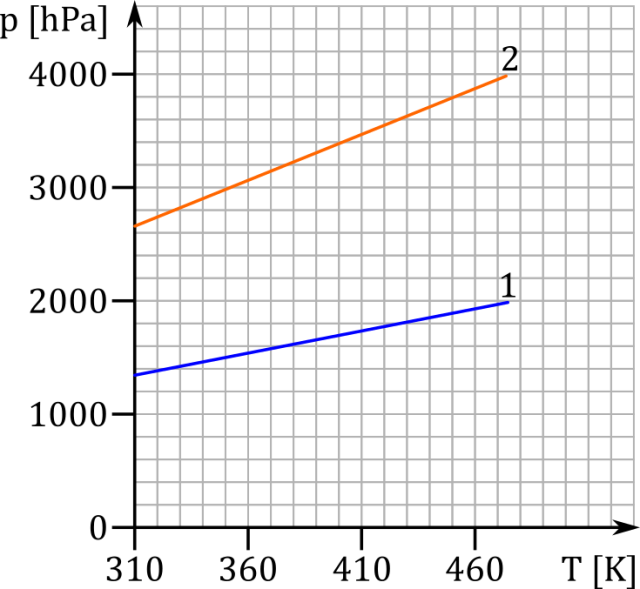 Z wykresu odczytujemy dowolną wartość temperatury i odpowiadające mu ciśnienie: T = 330 K i p = 1400 hPa.