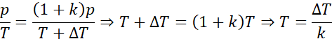 Korzystamy z własności przemiany izochorycznej – iloraz ciśnienia i temperatury jest stały. Końcowe ciśnienie jest równe początkowemu ciśnieniu powiększonemu o k-tą część początkowego ciśnienia, końcowa temperatura jest sumą początkowej temperatury i zmiany temperatury.
