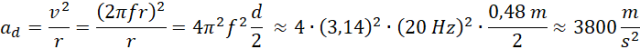 Na początku zamieniamy jednostkę częstotliwości na jednostkę układu SI. Następnie obliczamy przyspieszenie dośrodkowe na podstawie odpowiedniego wzoru.