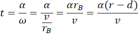 Korzystamy ze wzoru na prędkość kątową, który przekształcamy i wyznaczamy zależność na czas. Prędkość kątową zapisujemy za pomocą prędkości liniowej.