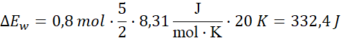 Korzystamy z pierwszej zasady termodynamiki. Gaz nie wykonuje pracy więc zmiana nergii jest równa dostarczonemu ciepłu, które obliczamy ze wzoru na ciepło molowe gazu dwuatomowego przy stałej objętości.