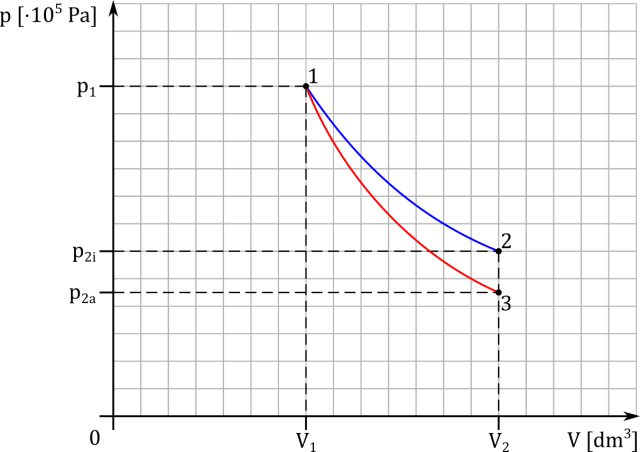 W tym zadaniu na podstawie wykresu oszacuj wartość pracy wykonanej przez gaz w przemianach izotermicznej i adiabatycznej. Przyjmij, że pole jednej kratki na wykresie odpowiada energii o wartości 14 J.