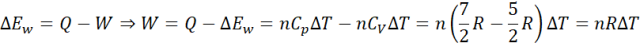 Więc z pierwszej zasady termodynamiki, gdzie W jest pracą wykonaną przez gaz, a Q ciepłem dostaczonym przy ogrzewaniu przy stałym ciśnieniu, gdzie