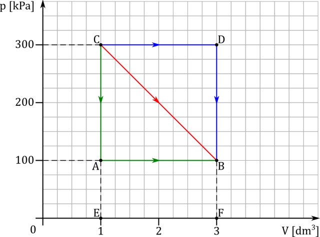 W tym zadaniu oblicz bilans ciepła w procesach CDB, CB, CAB, jeśli energia wewnętrzna w stanie C jest równa energii wewnętrznej w stanie B, tzn.