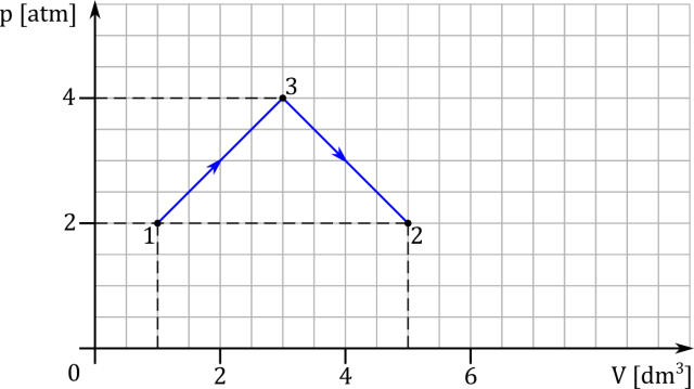 W tym zadaniu oblicz pracę wykonaną przez gaz podczas przejścia ze stanu 1 do 3 oraz 3 do 2 przedstawionych na wykresie. Przyjmij, że 1 atm = 105 Pa.