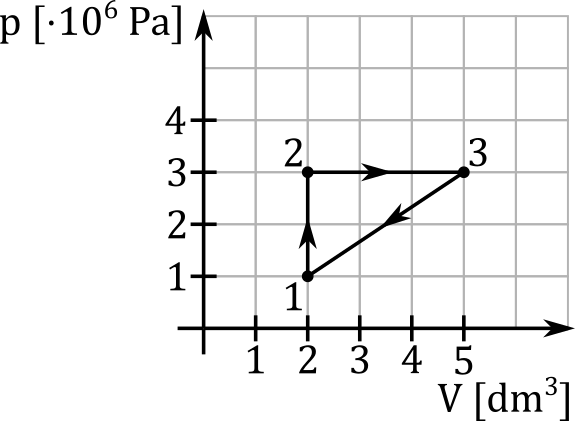 W tym zadaniu oblicz najwyższą temperaturę w cyklu przemian przedstawionym na wykresie, jeśli najniższa wynosi T1 = 400 K. Znane są stała gazowa R, ciepło molowe gazu jednoatomowego przy stałej objętości
