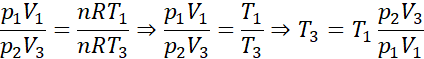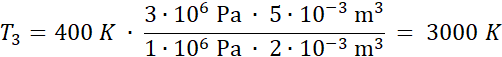 Najwyższa temperatura występuje w stanie, w którym iloczyn ciśnienia i objętości jest największy, czyli w punkcie 3. Zapisujemy równania Clapeyrona dla stanów termodynamicznych 1 i 3, a następnie dzielimy równania stronami i wyznaczamy temperaturę w stanie 3.