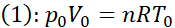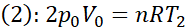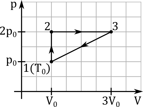 W tym zadaniu oblicz ciepło pobrane przez gaz w czasie cyklu przemian n = 2 moli jednoatomowego gazu doskonałego przedstawionego na wykresie. Stan termodynamiczny gazu w punkcie (1) jest określony przez parametry p0 i V0, a jego temperatura wynosi T0 = 100 K. Znane są stała gazowa R, ciepło molowe gazu jednoatomowego przy stałej objętości