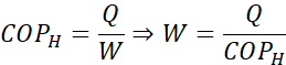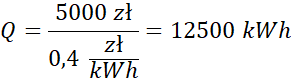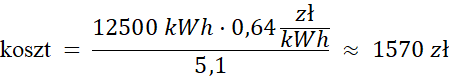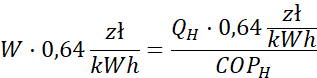 Obliczamy ilość zużytej do ocieplania energii, dzieląc zapłaconą kwotę przez cenę za 1 kWh energii. Korzystając ze wzoru na współczynnik efektywności, obliczamy pracę dostarczoną do pompy, która jest równa zużytej energii elektrycznej. Ostateczną kwotę obliczamy, mnożąc ilość energii razy cena za 1 kWh energii.