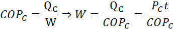 Korzystamy ze wzoru na współczynnik efektywności, gdzie ciepło pobrane jest równe iloczynowi mocy chłodniczej i czasu: