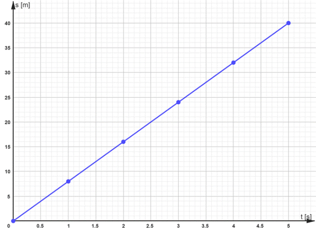 Wykres przedstawia zależność drogi od czasu: s(t) w ruchu jednostajnym prostoliniowym – w każdej sekundzie ruchu skuter przebył taką samą drogę. Prędkość w tym ruchu określana jest jako stosunek drogi (s) i czasu (t).