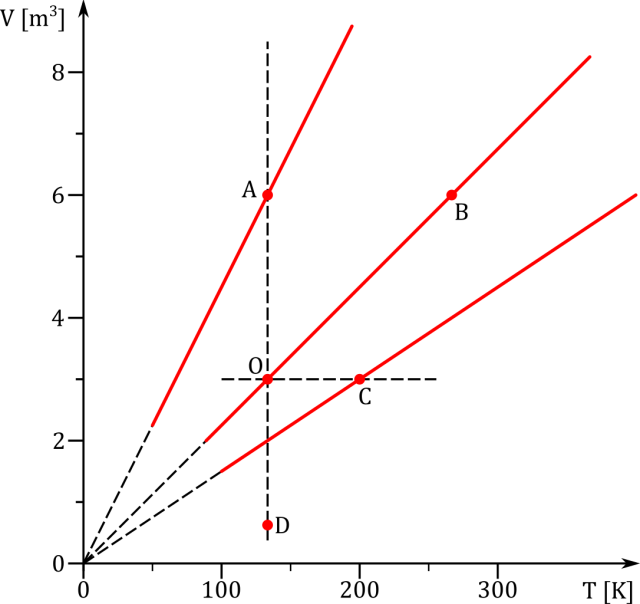 W tym zadaniu spośród punktów A, B, C i D na wykresie przedstawiającym izobary wybierz ten, w którym gaz ma takie samo ciśnienie co w punkcie O.