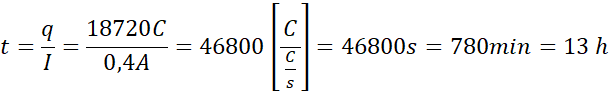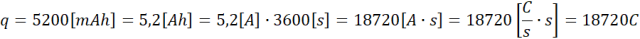 Na początku zamień jednostkę ładunku elektrycznego z mAh na C. W tym celu na początku zamień mA na A, pamiętając, że 1 A = 1000 mA, a następnie godziny na sekundy, pamiętając, że 1 h = 3600 s.