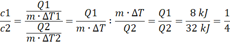 Masy obu ciał są takie same, a dokonując obliczeń dla jednakowej temperatury, pozostaje porównanie ilości ciepła, jaka została dostarczona ciału przy danej temperaturze. Na tej podstawie otrzymujemy stosunek ciepeł właściwych obu ciał – widzimy, iż wynosi on 1:4, zatem ciało II ma cztery razy większe ciepło właściwe, niż ciało I.