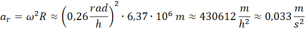 Oblicz w przybliżeniu wartość przyspieszenia dośrodkowego mieszkańców równika, przyjmując, że okres obrotu Ziemi wokół osi , a promień Ziemi Następnie oblicz, ile razy wartość tego przyspieszenia jest mniejsza od wartości przyspieszenia ziemskiego.