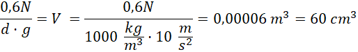 Oblicz, ile wynosi 3-krotność siły wyporu. Następnie podziel obustronnie równanie przez iloczyn gęstości i przyspieszenia ziemskiego tak, aby po prawej stronie równania pozostała jedynie objętość. Na koniec podstaw odpowiednie wartości.