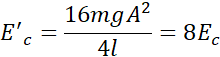 Korzystając ze wzorów na okresy drgań, wyliczamy współczynnik sprężystości, który następnie podstawiamy do wzoru na energię całkowitą, uzależniając tym samym wzór od amplitudy i długości wahadła. Następnie dokonując zmian podanych w treści, otrzymujemy, że nowa energia mechaniczna to ośmiokrotność starej, zatem wzrosła ośmiokrotnie.