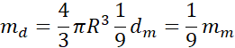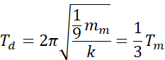 Rozpisujemy wzory na okresy drgań dla poszczególnych kuli, następnie korzystając z tego, że kule są takich samych promieni, a gęstość drewnianej jest dziewięć razy mniejsza niż metalowej, obliczamy masę drewnianej kuli w zależności od masy metalowej i podstawiamy do wzoru na okres kuli drewnianej. W ten sposób otrzymujemy końcowy wynik.