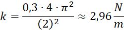 Korzystając ze wzoru na współczynnik sprężystości oraz na prędkość kątową obliczamy szukaną wielkość.