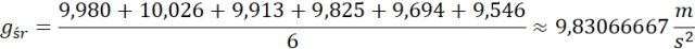 Na podstawie danych w tabeli obliczamy przyspieszenie średnie, które będzie średnią arytmetyczną podanych wartości, następnie korzystając z NKP obliczamy niepewność pomiarową i zapisujmy wynik końcowy.