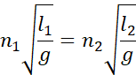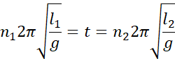 Okres drgań to czas podzielony przez liczbę wahnięć, jakie wahadło wykonało w tym czasie. Na podstawie tej zależności wyprowadzamy wzór na czas. Zgodnie z warunkami zadania, obydwa ciała mają się mieć taką samą fazę ruchu, czyli każde wahadło musi wykonać pełną liczbę wahnięć w tym samym czasie, co daje nam równanie