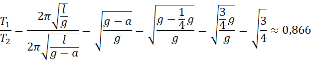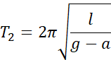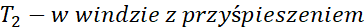 Okres pierwszy wyliczamy wprost ze wzoru, gdyż winda jedzie ze stałą prędkością, to przyśpieszenie całego układu jest stale równe g, sytuacja się zmienia, kiedy winda zacznie zjeżdżać w dół ruchem jednostajnie przyśpieszonym, wówczas na wahadło będzie działać dodatkowo siła bezwładności zwrócona przeciwnie do wektora przyśpieszenia windy, zatem wypadkowa siła działająca na ciężarek zawieszony na wahadle jest różnicą tych sił, więc przyśpieszenie całego układu jest równe