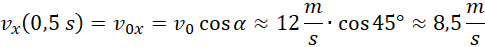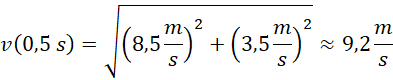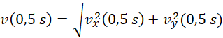 Prędkość w danym momencie możemy obliczyć, korzystając z twierdzenia Pitagorasa, gdzie przyprostokątnymi trójkąta są prędkości na kierunkach x i y. Prędkość na kierunku x jest niezmienna, prędkość na kierunku y obliczamy, korzystając ze wzoru prawidłowego dla ruchu jednostajnie opóźnionego.