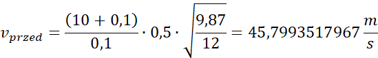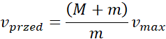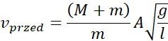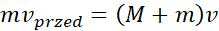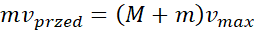 Korzystamy na początku z zasady zachowania pędu i zapisujemy równanie, zauważmy, że prędkość, z jaką będzie się poruszać kula wraz z pociskiem po zderzeniu niesprężystym jest prędkością, z jaką obiekt przejdzie przez położenie równowagi, zatem jest to prędkość maksymalna ruchu drgającego, z równania wynikającego z zasady zachowania pędu oraz wzoru na prędkość maksymalną wyprowadzamy wzór na prędkość pocisku przed zderzeniem.