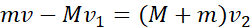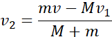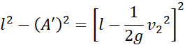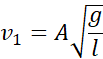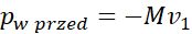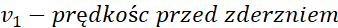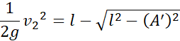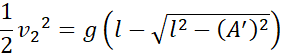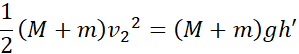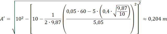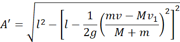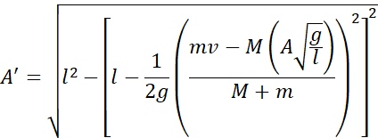 Korzystając ze wzoru na prędkość maksymalną ruchu drgającego, która jest prędkością przez zderzeniem, zapisujemy zasadę zachowania pędu, na podstawie której wyprowadzamy wzór na szukaną amplitudę, w miejscu wysokości podstawiamy zależność, wyprowadzoną z twierdzenia Pitagorasa dla trójkąta powstałego poprzez nowe wychylenie z równowagi po zderzeniu.
