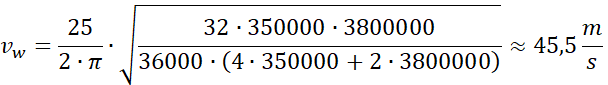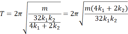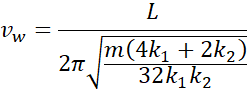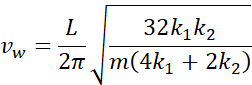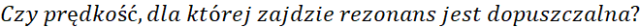 Prędkość wagonu to stosunek długości szyny do okresu. Aby zaszło zjawisko rezonansu, to częstość kołowa pociągu musi być równa częstości kołowej drgań własnych. Okres obliczamy zatem ze standardowego wzoru. Współczynnik wypadkowy całego układu to czterokrotność współczynnika sprężystości pojedynczego wagonu, ponieważ są one połączone równolegle, korzystając z informacji do zadania, obliczamy wypadkowy współczynnik dla wagonu, wiedząc, że są to dwa układy połączone ze sobą szeregowo z czego każdy to układ sprężyn połączonych równolegle, tak obliczona prędkość jest mniejsza, niż prędkość maksymalna pociągu, zatem zjawisko może zajść w zakresie dopuszczalnej prędkości.