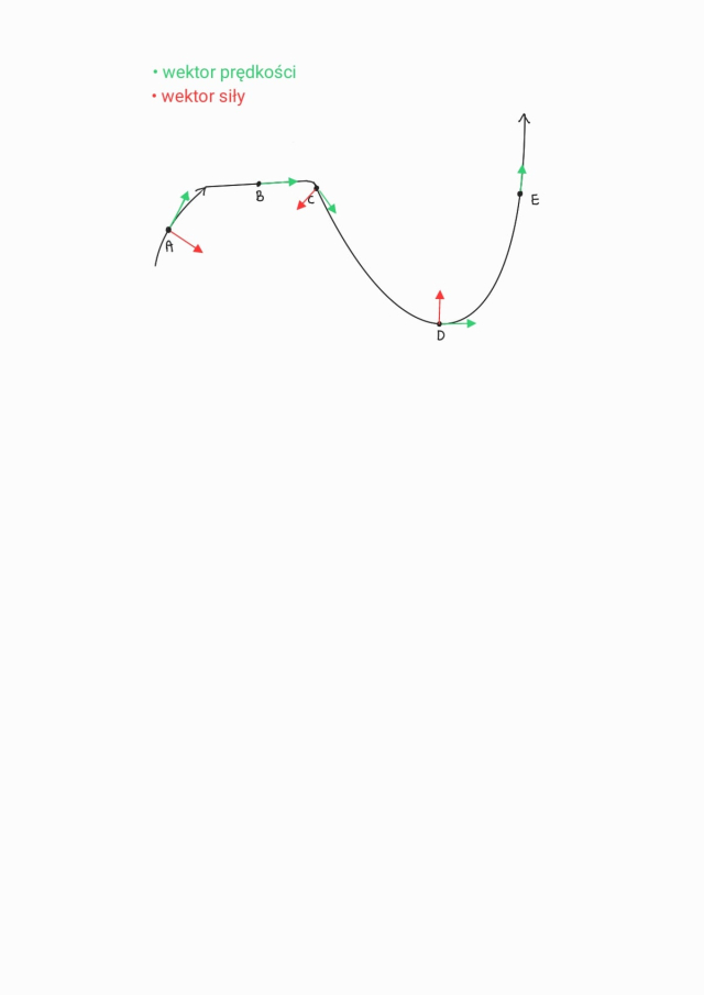 W tym zadaniu musisz dorysować wektory prędkości i siły działające na pilota w punktach zaznaczonych rysunku.