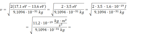 ). W takim razie uzyskana przez niego energia pozwoliła mu się wyrwać z atomu wodoru. Szukaną prędkość (