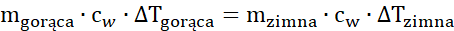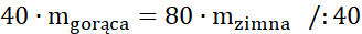 Przeprowadź bilans cieplny i zauważ, że całe ciepło pobrane z gorącej wody jest równe ciepłu pobranemu przez zimną wodę. Zakładamy, że ciepło właściwe jest jednakowe dla wody w różnej temperaturze.