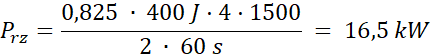 W tym zadaniu oblicz rzeczywistą moc silnika spalinowego dla czterech cylindrów, jeśli praca użyteczna w czasie jednego cyklu wynosi 400 J, a wał wykonuje 1500 obrotów w ciągu 1 min, przy czym na 1 cykl silnika przypadają 2 obroty wału. Moc wału korbowego jest mniejsza o 17,5% od obliczonej przy użyciu wzoru