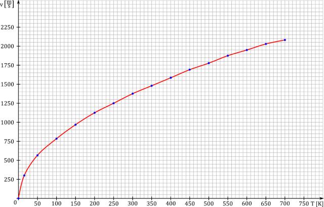 Z wykresu odczytujemy dowolną wartość temperatury oraz odpowiadającą mu średnią prędkość, i wstawiamy wartości do wzoru:
