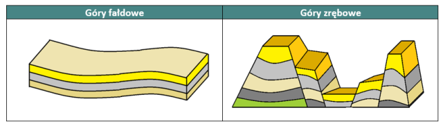 Góry fałdowe powstały w wyniku osadzania skał w morzach i oceanach (akumulacja), które zostało przerwane na skutek ruchów górotwórczych. Sfałdowane i wypiętrzone osady utworzyły łańcuchy górskie. Góry zrębowe powstały w wyniku oddziaływania czynników zewnętrznych (wód płynących, wiatru), które spowodowały ich obniżenie oraz zrównanie.
