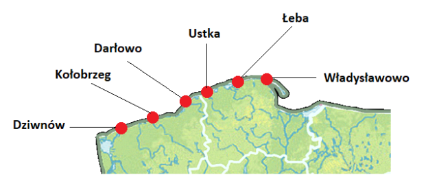 W tym zadaniu musisz podpisać zaznaczone na mapie porty rybackie nazwami podanymi w ramce.