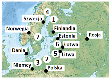 Oznacz na mapie rzeki, które wpływają bezpośrednio do Morza Bałtyckiego, wpisując odpowiadające im cyfry w koła.