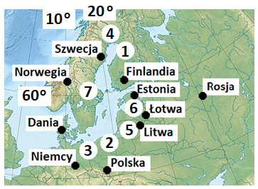 Zapisz w kwadratach na mapie wartości południków oraz równoleżnika, które przebiegają przez Morze Bałtyckie.