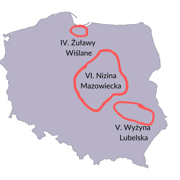 IV. Żuławy Wiślane, V. Wyżynę Lubelską, VI. Nizinę Mazowiecką.